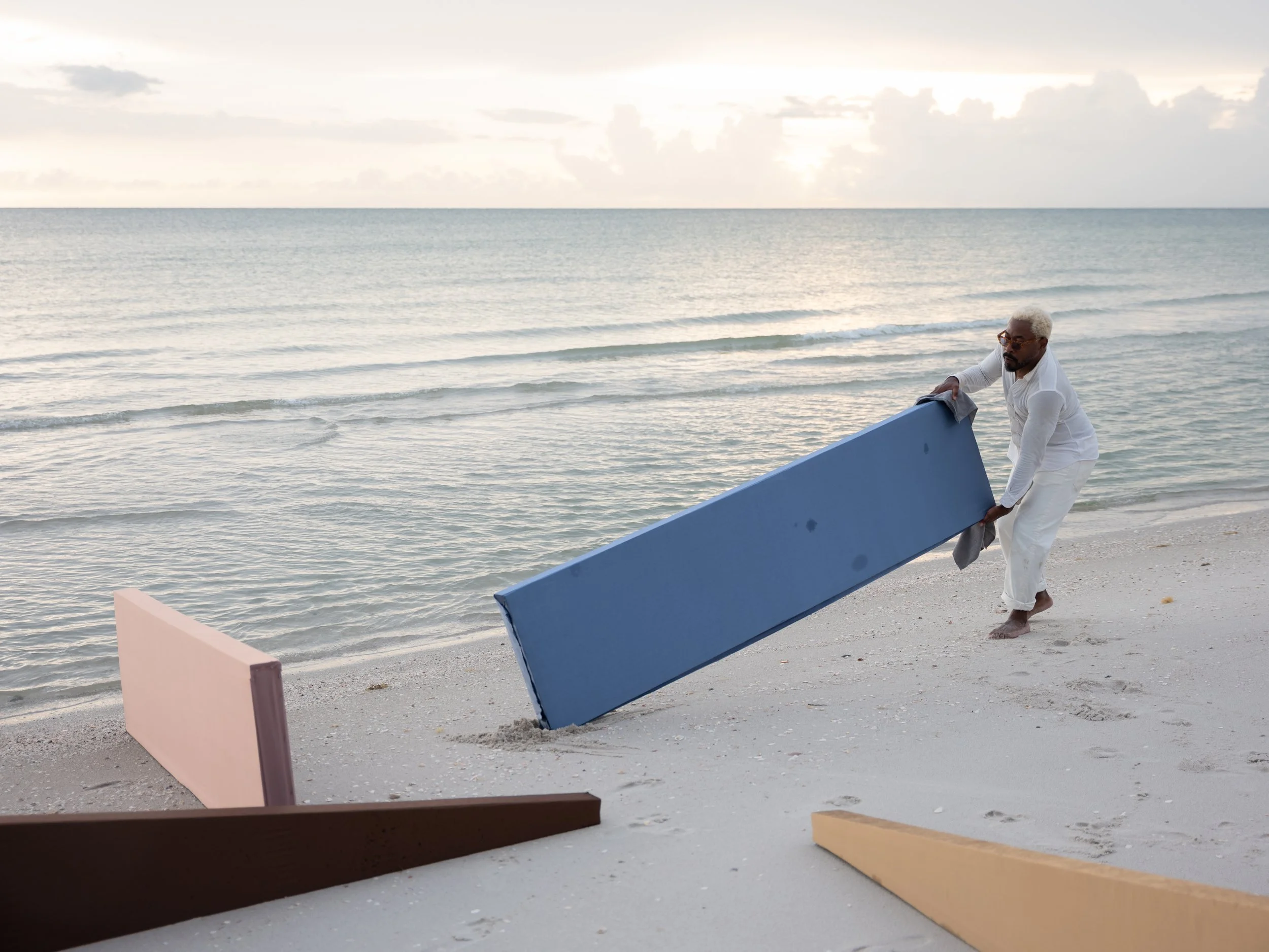 James Perkins (b. 1978) is an American sculptor who creates a contemporary discourse for the nonsite—a term originated by Robert Smithson in 1968. Perkins collaborates with nature to make a mark, rather than presenting raw earth as an art object. His “post-totem structures”, silk canvases stretched on wooden frames, are buried in the earth for up to two years and are shaped and painted by the bleaching sun, salt spray, sand, soil, and hurricane force winds. His unique practice merges the philosophies of Land Artists like Michael Heizer, Robert Irwin, and James Turrell, with the sensibilities of minimalist painters like Ad Reinhardt, Barnett Newman, and Mark Rothko. The performance elements of his work hearken the bodily action painting of Jackson Pollock or Helen Frankenthaler. His work activates these histories to contemplate how abstraction and land can invoke a society to consider a more harmonic, sustainable and shared vision of the future.