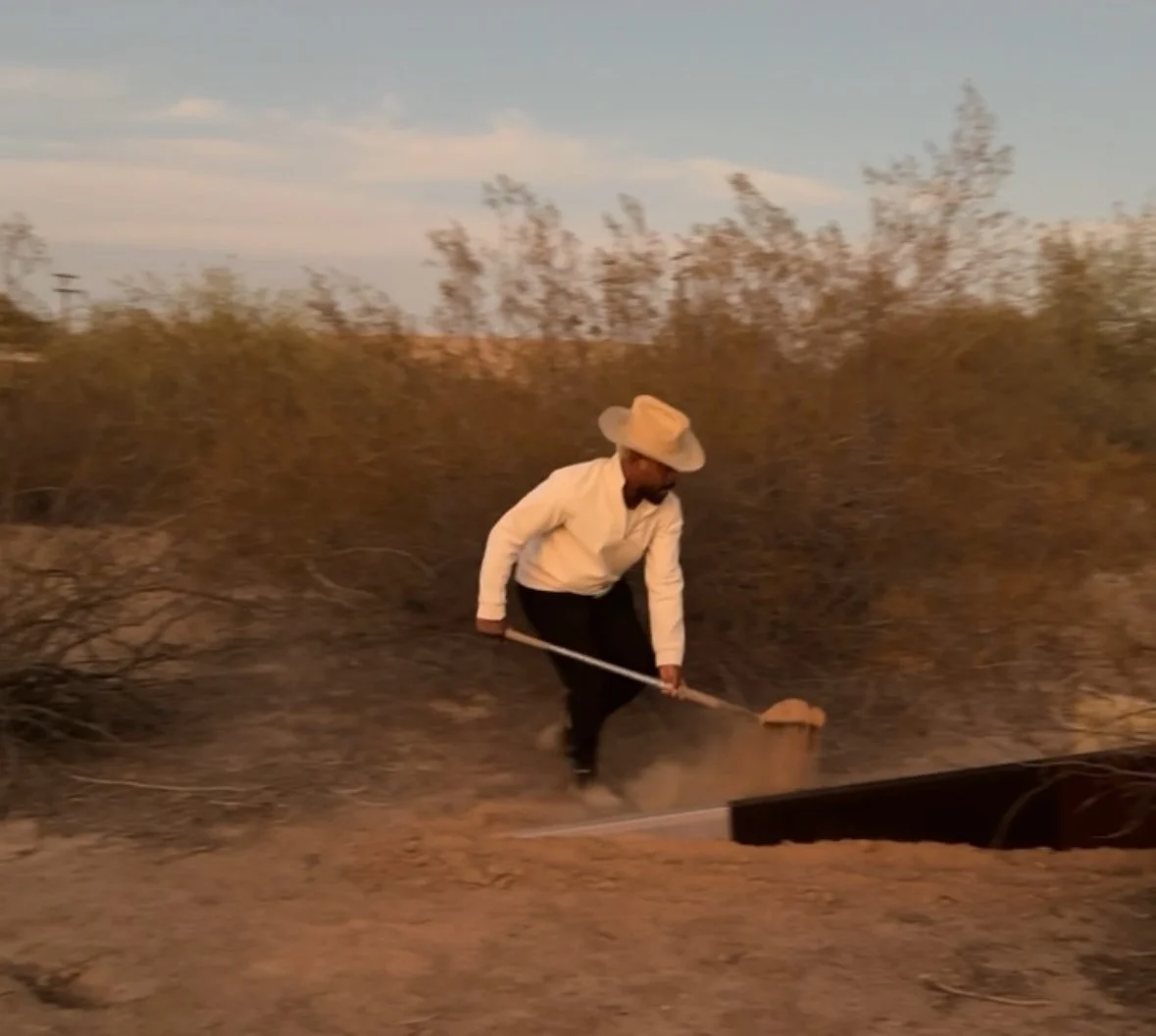 As the October sun sinks beneath an expansive sky, James Perkins digs narrow rows into the dusty desert soil. Repetition becomes ritual—a preparation for burial. One after another, the shovel strikes the ground, scattering particulates into the refracted light of twilight. Perkins places silk-wrapped structures into shallow resting places, gently pushing earth up to their delicate surfaces—part buried, part revealed. A performance of intention, a ceremonial act to initiate an interval of chance.